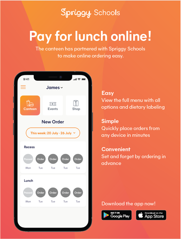 Lunches can be ordered online via the Spriggy Schools App before 9am on the day.